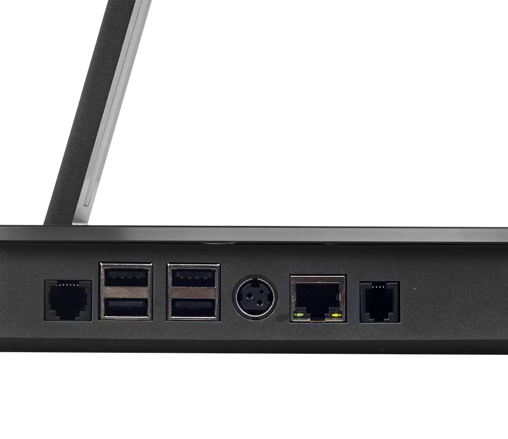 El equipo cuenta con múltiples puertos USB, HDMI, Ethernet y conectividad Wi-Fi, lo que permite la conexión de periféricos como impresoras de recibos, lectores de códigos de barras y gavetas de dinero.