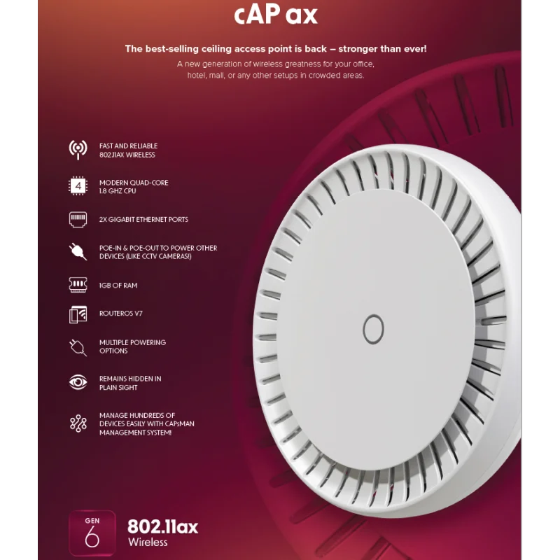 Nota: Aunque el modelo de la pregunta es «AX1800 WiFi6 cAPGi-5HaxD2HaxD», MikroTik lo comercializa como cAP XL ac o cAP ax. Las velocidades AX1800 (aproximadamente 1.8 Gbps combinados) son consistentes con las capacidades de este dispositivo Wi-Fi 6 de doble banda.